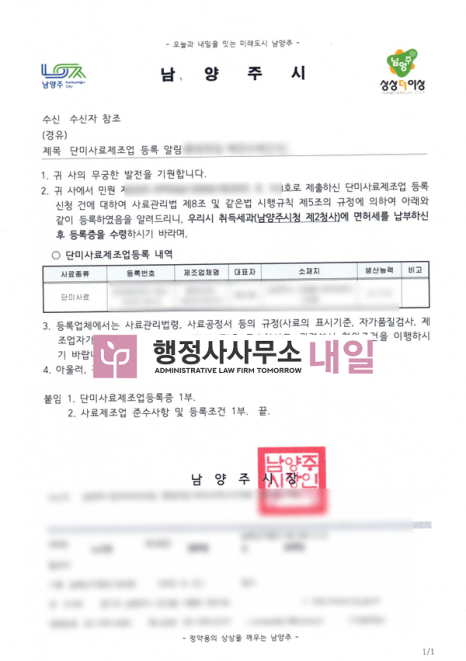 서류를 제출한 뒤 담당 공무원의 현장실사가 있었고 문제없이 사료제조업 등록증이 발급되었답니다.