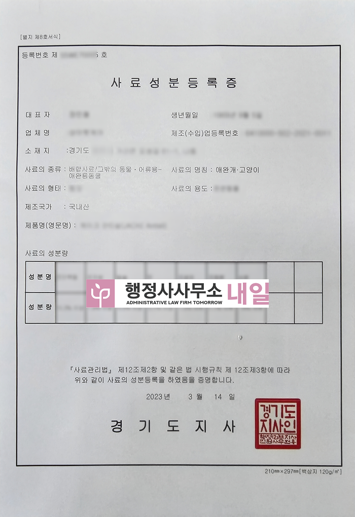 저희 내일행정사는 사료제조업등록부터 성분등록, 표시사항까지 전반적인 부분에 대해 도움을 드리고 있습니다.