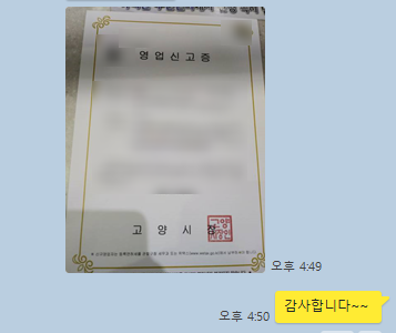 발급받은 영업신고증 사진도 보내주셨답니다.
