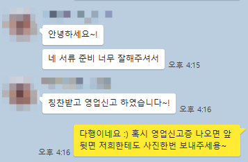 몇일동안 연락이 없으셔서 영업신고는 잘 하셨는지 여쭤보니