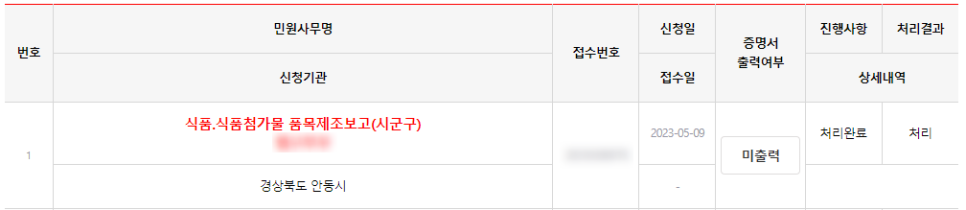접수 후 이틀 뒤인 5월11일에 처리가 완료되었습니다.