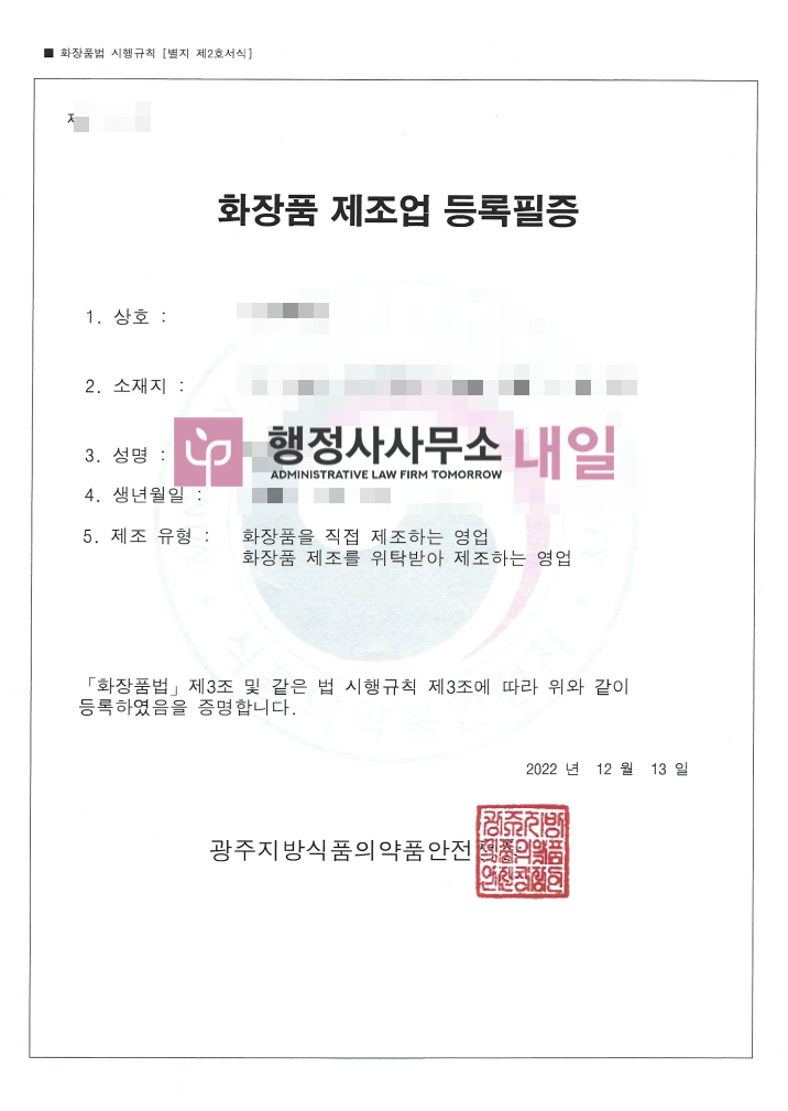 화장품책임판매업 과 화장품제조업 허가 등록 완료사례