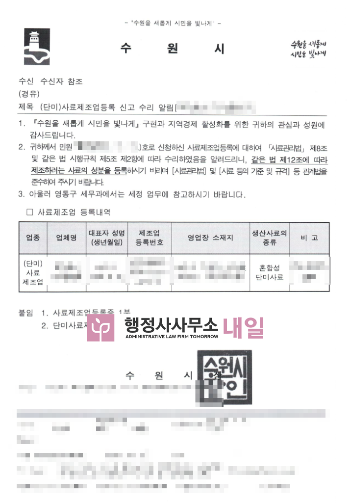 수원에 위치한 'ㄷ'업체의 사료제조업등록 신고를 도와드린 사례에 대해 소개해드리려구요😊