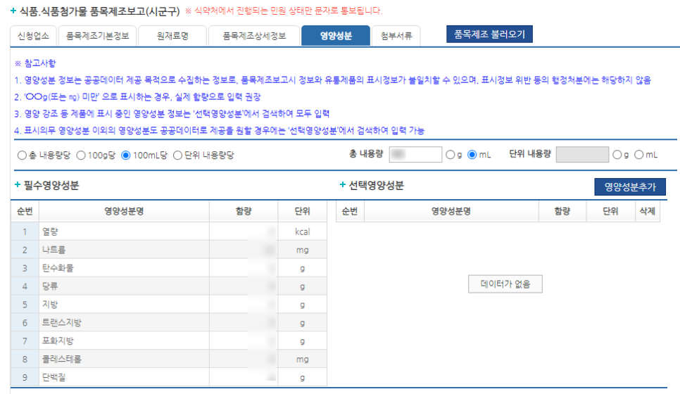 참고로, 지난달부터는 품목제조보고시에 영양성분표기 의무 유형일 경우, 영양성분도 기입을 해야합니다.