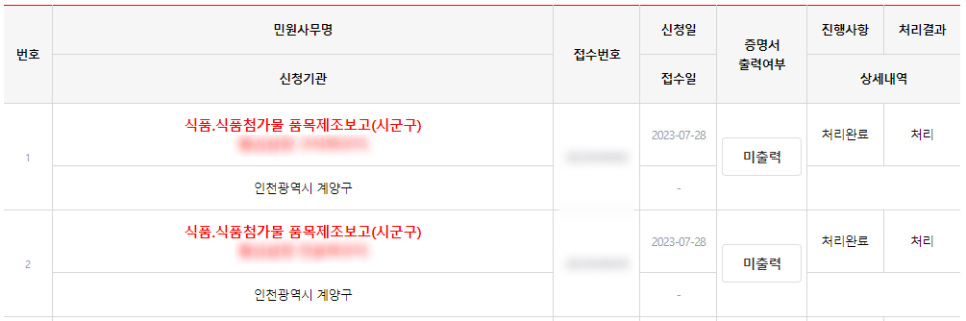 총 3개 업체의 7가지 제품에 대한 품목제조보고는 위처럼 완료되었답니다.